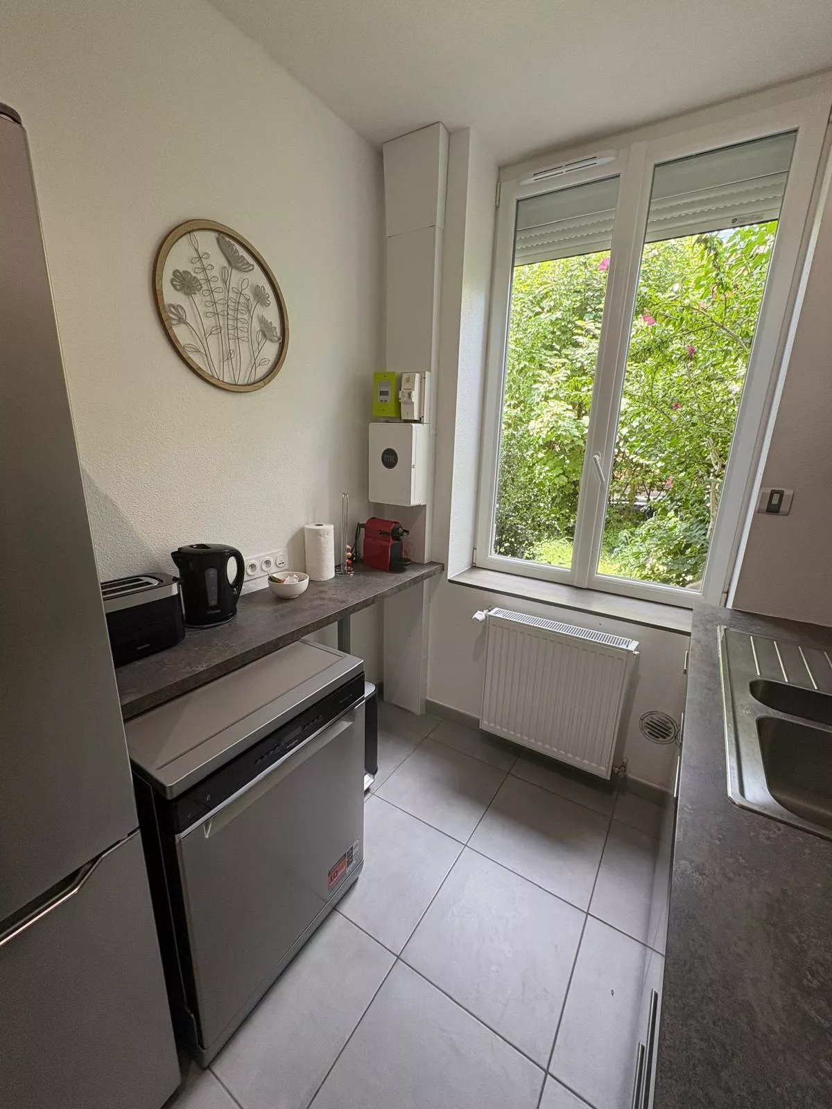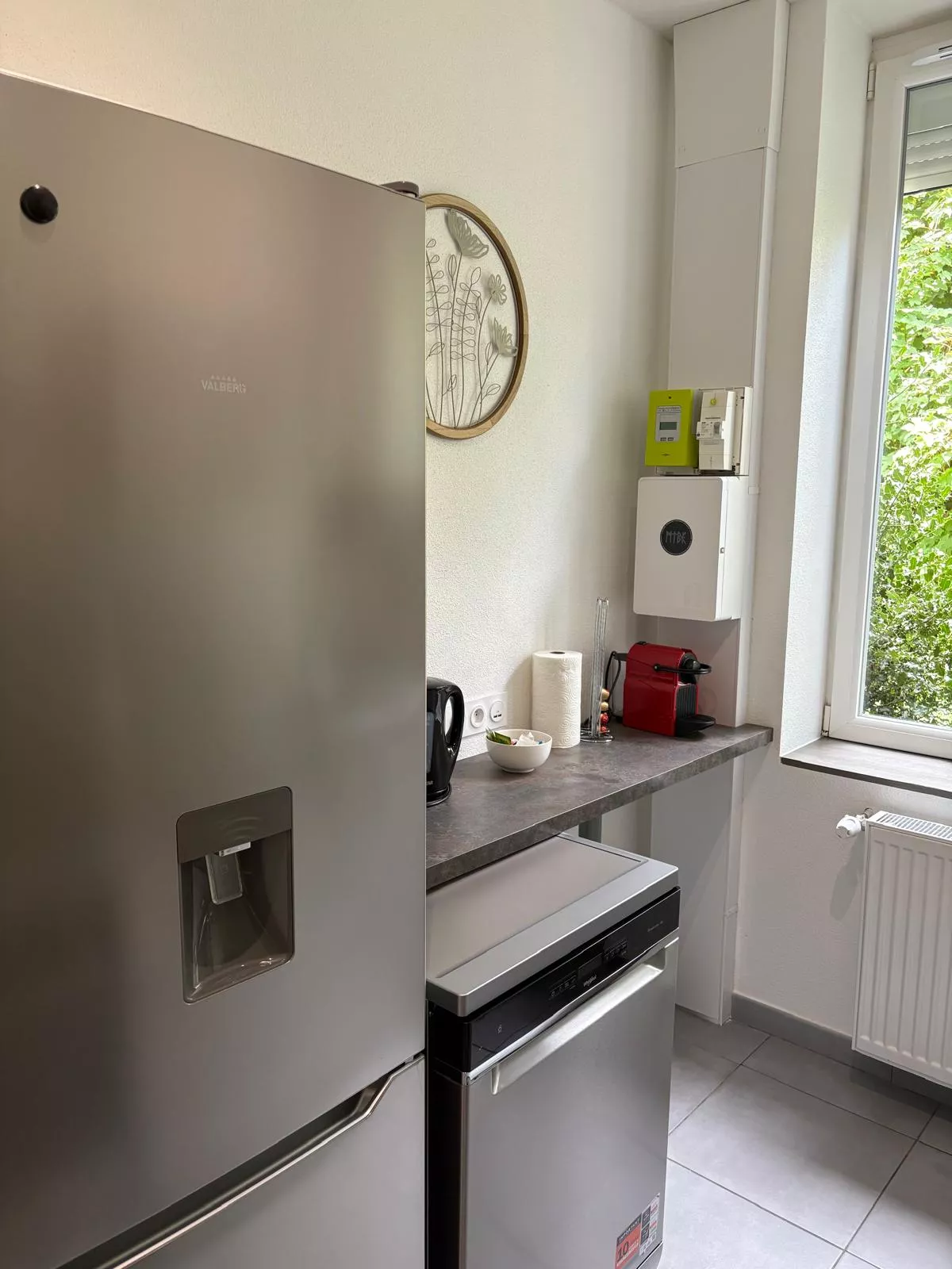 Une cuisine équipée avec machine à café Nespresso, lave vaisselle et machine à laver,