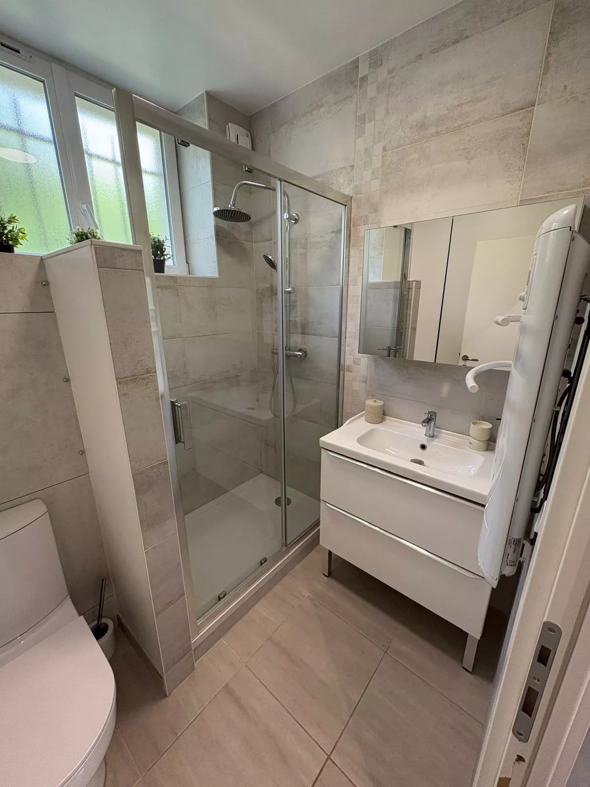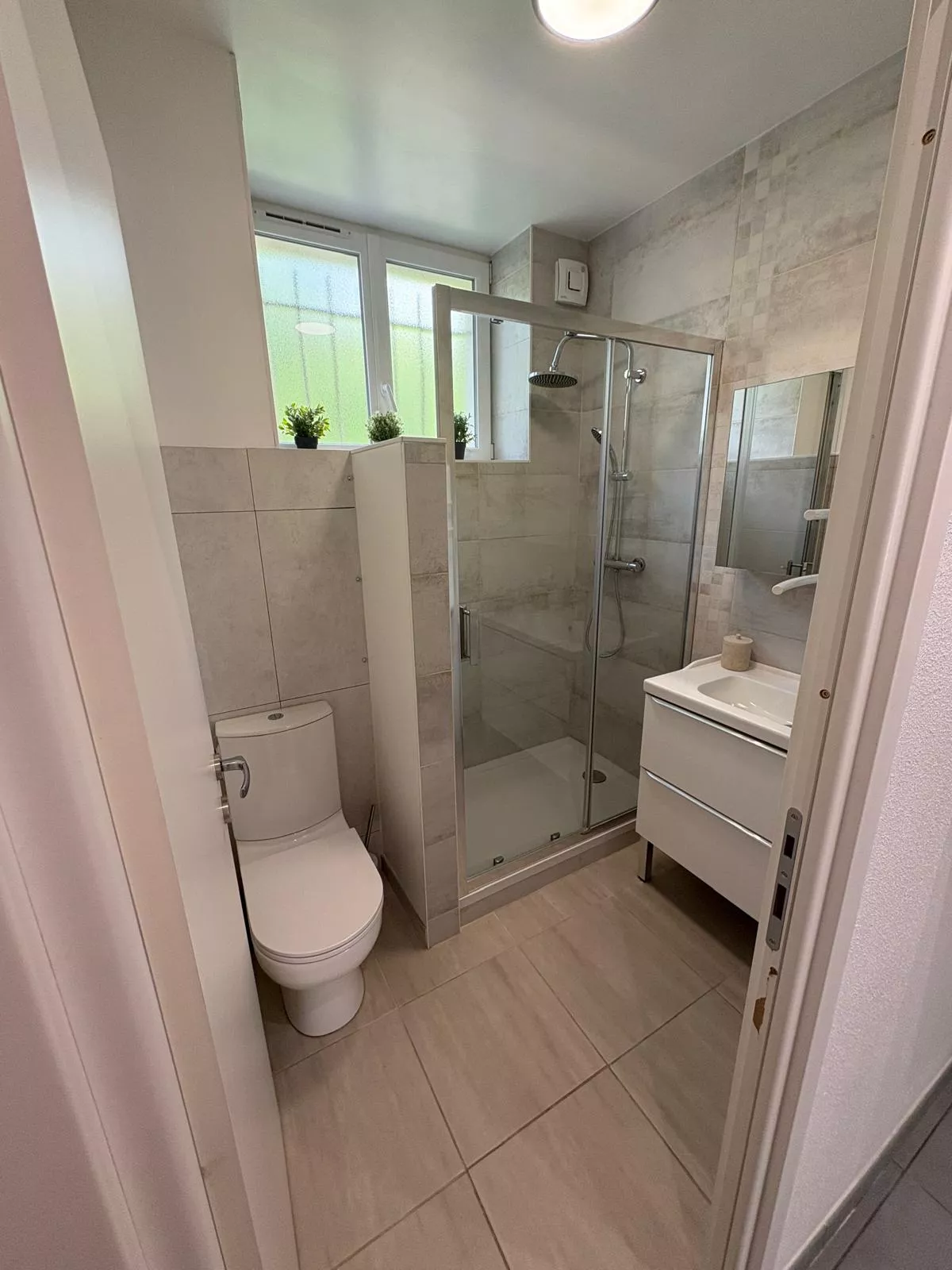 Une salle de bain avec douche, Wc