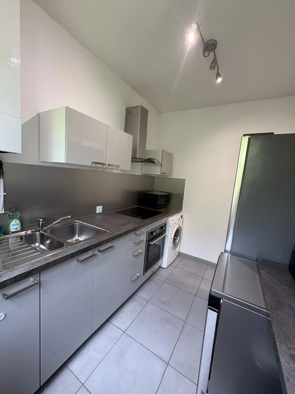 Une cuisine équipée avec machine à café Nespresso, lave vaisselle et machine à laver,